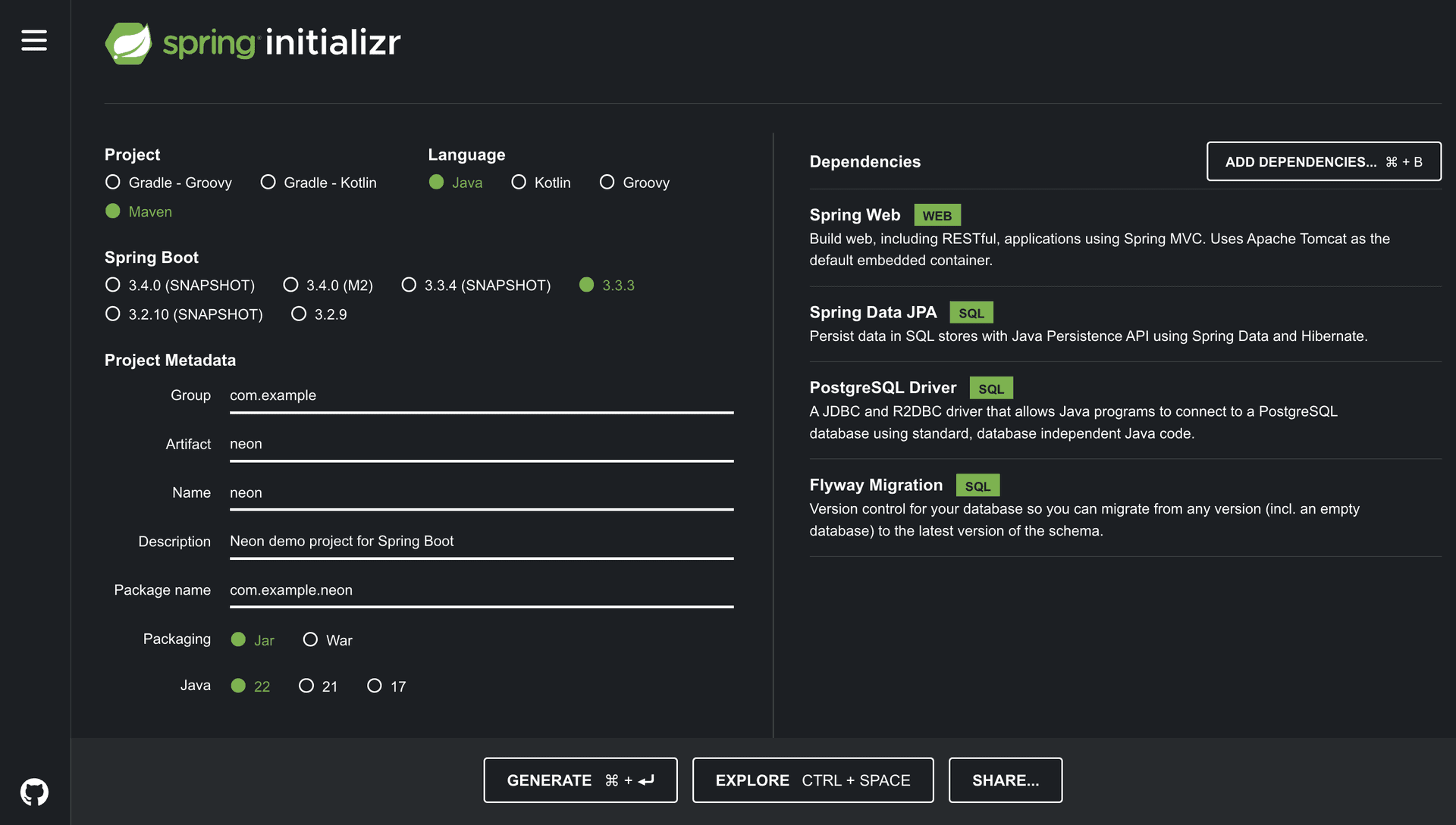 This guide will walk you through setting up and using Flyway for database migrations in a Spring Boot application with Neon Postgres.